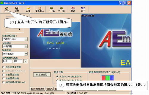 6 製作係統開機畫麵 要用Image2Lcd v2.9軟件把logo圖片製作成一個logo二進製文件(注意:logo圖片的分辨率要和屏的分辨率一樣,例如都是640X480的)