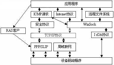 Windows CE的網絡通信基於一個按層組織的網絡堆棧[1 ] (network stack) ,如圖2所示。網絡堆棧實際上是Windows CE 的一個組件,它絡堆棧實際上是Windows CE 的de一yi個ge組zu件jian,它ta負fu責ze對dui網wang絡luo中zhong的de數shu據ju傳chuan輸shu進jin行xing處chu理li,將jiang來lai自zi於yu應ying用yong程cheng序xu的de數shu據ju分fen解jie成cheng若ruo幹gan小xiao段duan,並bing為wei每mei小xiao段duan加jia上shang相xiang關guan地di址zhi和he段duan的de分fen割ge信xin息xi,組zu成cheng可ke以yi存cun貯zhu轉zhuan發fa的de信xin息xi包bao(packets) ,信息包中的地址確保數據達到最終的目的端點。訪問網絡堆棧有如下三種方式:第一種是WinSock端口套接字方式。這是一個中間層的傳輸接口協議,WinSock 負責對建立的信息包的所有頭信息細節進行處理, 但可以不管其數據格式。Windows CE 的網絡通信都直接或間接地使用WinSock。采用IrDA 協議實現基於紅外線套接字的客戶/ 服務器網絡通信是Windows CE平台的一個特色。第二種為WinInet API 方式。WinInet API是微軟公司基於Win32 平台的互聯網函數接口。Windows CE 的WinInet API 對其進行了某些限製或擴展,它提供的高級數據協議除了常見的超文本傳輸協議HTTP 和文件傳輸協議FTP 外,還提供了對SSL的支持。API 方式避免了直接使用WinSock 訪問網絡的操作,簡化了網絡編程。第三種為CIFS 重定位器方式。Windows CE 通過對遠程訪問服務RAS 客戶的支持,允許基於Windows CE的設備與遠程主機建立連接。