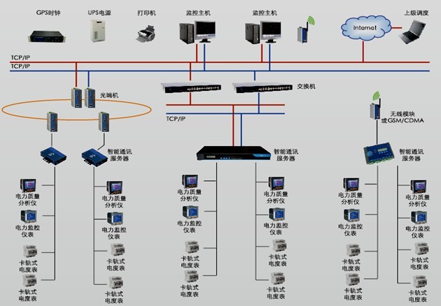 圖3 ACR120EL、ACR230ELH多功能電表外形及其在配電抽屜櫃中的應用 3、係統組網 dianliyibiaokezuoweineibuguanlidianbiaodandushiyong,qudaidaliangchuantongdemoniyibiao,yikezuoweidianlijiankongxitongdeqianduanshebei,shixianyuanchengshujucaijiyukongzhi。fuhegongyebiaozhundeRS485通訊接口,使得組網輕鬆便捷,是SCADA係統集成的理想選擇。大型公共建築電能管理係統可以根據現場情況,采用現場總線以光纖環網、以太網或無線等組網方式實現電能集抄與電能分項計量功能。係統以計算機、通訊設備、現場電力儀表計量裝置為基本工具,為實時數據采集、遠程管理與控製提供了基礎平台,它可以和檢測、控製設備構成複雜的電力監控與電能管理係統。該係統主要采用分層分布式計算機網絡結構,分站控管理層、網絡通訊層和現場設備層[3](如圖4)。