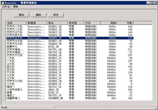 在這個界麵中,用戶可以完成增加、刪除和修改數據表等操作。數據轉儲組件將轉儲的單位定義為數據表,用戶可以定義數據表中轉儲的數據、轉儲的時間和時間間隔等相關信息。