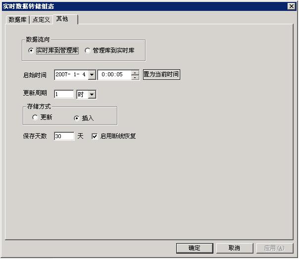 在“其他”標簽頁中,用戶可以配置數據流向、啟始時間、更新周期、存儲方式等信息。在這裏說明一下“啟用斷線恢複”功能。