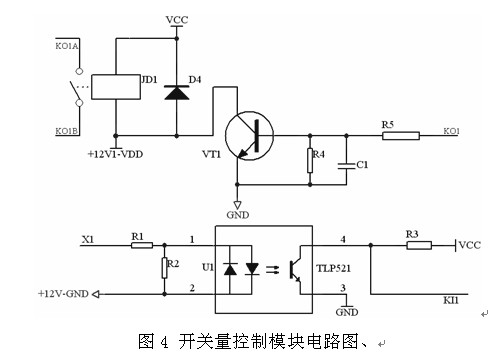 開關量控製模塊包括開關量輸入和告警輸出,其電路圖如圖4 所示。開關量輸入經光電耦合接入CPU ;告警由GPIO 口經光電耦合器連接到繼電器輸出。開關量輸入設有8 路,依次對應一次圖中的斷路器合、斷路器分、手車工作位置、手車試驗位置、接地刀位置以及彈簧儲能指示,其餘預留。開關量輸入對應一次圖可編程設置。開關量輸出設有6 路,依次輸出加熱器1 、加熱器2 、風扇、告警、照明、閉鎖的狀態。
