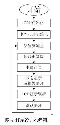 主程序完成上電或複位初始化,電能芯片初始化,其他外設初始化,溫濕度測量,讀取電參數,電量計算,狀態顯示及報警處理,LCD 顯示刷新及按鍵處理等功能,程序設計流程如圖5 。