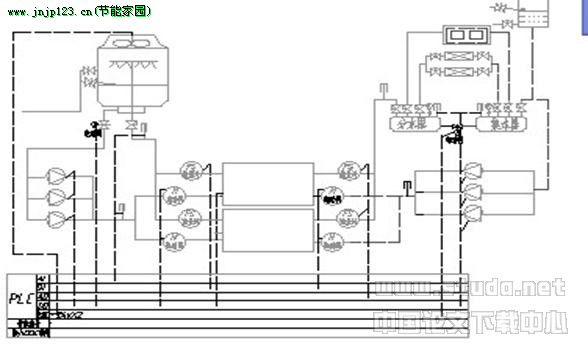 根據設定的參數,並考慮經驗運行數據,PLC應用反饋數據 (如室內溫度等)進行PID調節,以保證運行參數滿足係統要求。控製係統有三種運行方式:就地手動、軟手動和自動。就地手動就是通過就地手動操作設備對機組進行控製,軟手動是通過PLC對機組進行手動控製,自動則是根據編好的控製程序自動控製相關設備的啟、停及調節量。采用程序控製方式,杜絕冷劑汙染,有效便捷地實現冷水、冷卻水的變頻控製。通過有效合理地開、停控製,達到啟動速度快、停機時間短的目的,即能節省能耗,還能避免結晶,從而提高中央空調係統的安全性和經濟性。