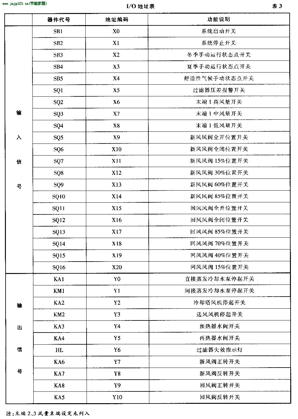 通(tong)常(chang)風(feng)閥(fa)的(de)自(zi)動(dong)控(kong)製(zhi),風(feng)閥(fa)上(shang)都(dou)安(an)裝(zhuang)有(you)行(xing)程(cheng)位(wei)置(zhi)傳(chuan)感(gan)器(qi),通(tong)過(guo)風(feng)閥(fa)行(xing)程(cheng)位(wei)置(zhi)傳(chuan)感(gan)器(qi)的(de)信(xin)號(hao)來(lai)控(kong)製(zhi)風(feng)閥(fa)的(de)開(kai)度(du)從(cong)而(er)達(da)到(dao)適(shi)當(dang)的(de)新(xin)回(hui)風(feng)比(bi)要(yao)求(qiu)。由(you)於(yu)控(kong)製(zhi)係(xi)統(tong)要(yao)對(dui)模(mo)擬(ni)信(xin)號(hao)進(jin)行(xing)模(mo)數(shu)轉(zhuan)換(huan),內(nei)部(bu)還(hai)要(yao)進(jin)行(xing)計(ji)算(suan),最(zui)後(hou)經(jing)模(mo)數(shu)轉(zhuan)換(huan)來(lai)驅(qu)動(dong)風(feng)閥(fa)電(dian)機(ji)到(dao)相(xiang)應(ying)的(de)位(wei)置(zhi),從(cong)而(er)達(da)到(dao)要(yao)求(qiu)。其(qi)程(cheng)序(xu)設(she)計(ji)比(bi)較(jiao)複(fu)雜(za)且(qie)風(feng)閥(fa)成(cheng)本(ben)也(ye)比(bi)較(jiao)高(gao)。由(you)於(yu)本(ben)係(xi)統(tong)用(yong)PLC當主控製器,可以用開關量信號取代模擬量信號,且PLC用梯形圖編程,程序編寫比較容易,且易實現。新風、回風、排風風閥在全開或全閉處都有開關量閥位信號且在15%、30%、60%、85%處都有開關量閥位信號送入PLC內部,由於新風和排風可以聯動控製,可以省去排風閥的閥位信號。例如:要求新回風風閥開度在(15%,85%)時,PLC的輸出端輸出開關量信號控製繼電器或接觸器,控製新回風風閥電機的轉動,當到達15%、85%時,15%、85%開關量閥位信號送人PLC內部,PLC內部由於程序的控製,控製新回風風閥電機的停止。這些閥位的控製都是在不同的運行工況下進行的有程序的編寫來完成。