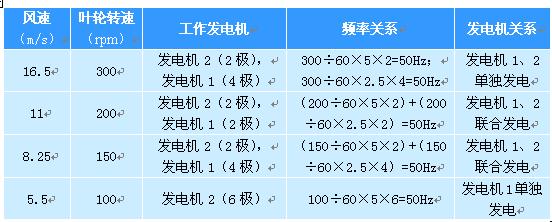 由表1可知(不考慮電機滑差率),在風速11m/s及8.25m/s處,2個發電機利用“合頻”特性聯合發電,發電機2的輸出接入發電機1的轉子電路。在具體應用中,當風速為7及以下時可用第1種方式,即發電機2(6極)單獨發電;當風速為7上到9.5時可用第2種方式,即發電機2(2極)與發電機1(4極)聯合發電;當風速為9.5以上到13時可用第3種方式,即發電機2(2極)與發電機1(2極)聯合發電;當風速為13以上時可用第4種方式,即發電機2(2極)及發電機1(4極)單獨發電。