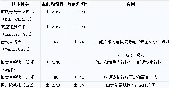 沉積薄膜的均勻性是一項很重要的指標,目前市場上太陽電池標準訂的越來越高,盡管有些色差片的效率很高,也隻能按照B級片處理。各種設備的標稱均勻性列於表3。