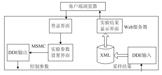 登錄界麵,實驗參數設置界麵和實驗結果顯示界麵都是用ASP.NET建立的動態網頁Socket客戶端程序和Socket服務器程序是用VB.NET編寫,在Web服務器中同時設置Socket的(de)服(fu)務(wu)器(qi)程(cheng)序(xu)和(he)客(ke)戶(hu)端(duan)程(cheng)序(xu)是(shi)為(wei)了(le)將(jiang)修(xiu)改(gai)後(hou)的(de)實(shi)驗(yan)參(can)數(shu)及(ji)時(shi)的(de)送(song)給(gei)工(gong)控(kong)機(ji),實(shi)現(xian)在(zai)線(xian)實(shi)時(shi)調(tiao)節(jie)參(can)數(shu)的(de)功(gong)能(neng)。同(tong)時(shi)工(gong)控(kong)機(ji)送(song)回(hui)的(de)采(cai)樣(yang)值(zhi)被(bei)寫(xie)入(ru)XML文件,實驗參數從參數設置界麵傳給Socket客戶端程序,它們之間采用微軟消息隊列進行通信,是並發執行的。Socket服務器程序將工控機送回的采樣值寫入XML文件,實驗結果顯示界麵同時讀這個文件,並將其中的數據轉換成圖形的形式展現給用戶。