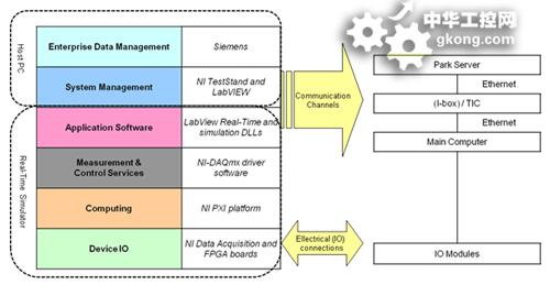 在主計算機上的軟件通過以太網與位於PXI-1042Q機箱中的LabVIEW實時目標進行通信。LabVIEW實時模塊運行通常包含20到55個並行執行的仿真DLL的仿真軟件。這個解決方案能夠調用使用幾乎所有建模環境開發的用戶模型,例如NI LabVIEW控製設計與仿真模塊、The MathWorks, Inc. Simulink®軟件或是ANSI C代碼。我們仿真循環的典型執行速率是24 ms,為滿足未來處理能力擴展需求提供了大量裕量。