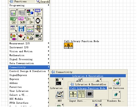 LabVIEW 中是通過Call Library Function Node(CLN)節點來完成DLL文件調用的。創建一個新的VI,右擊程序框圖,在Functions Palette中依次選中Connectivity――Libraries&Executables工具欄即可找到該節點(圖1)。