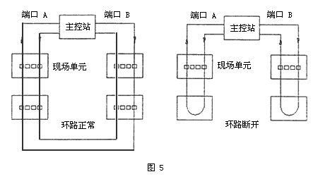 通信環路一旦斷開,在環路斷點一側的現場單元將會自動地形成各自一側完整的環路,繼續保持主控站與所有現場單元之間的通信。圖4為幾種常見的環路故障。圖5則是係統正常工作時和環路斷開後兩種方式的工作原理示意圖。