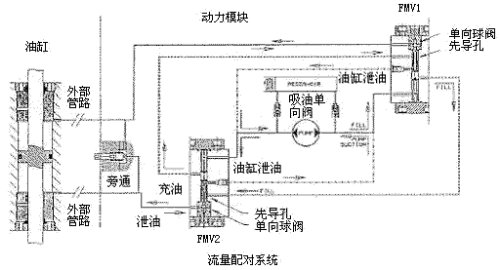 雙向齒輪泵通過兩個流量配對閥(FMV1和FMV2)中的一個來使雙作用缸的任一側增壓,為把活塞移動到左邊,通過A端口使FMV2加壓,閥芯在壓差作用下左移打開逆止閥,液壓油可從端口D流到B,從端口A流到E,在從D流出的油壓作用下活塞向左移動。需要說明的是在圖示活塞的運行方向和負載方向相反的情況下,由於B、C端口的壓力很低,幾乎為大氣壓力,此時FMV2還起到節流閥的作用使Dqiangbaochishidangdebeiya,congerbaozhengxitongyunxingpingwen。dangyougangshuchudaodazhidingweizhishibengtingzhigongzuo,lianggenizhifajunguanbi,yeyayouliuzaigangnei,madabuxuyaocaozuojiukeyishiyeyagangdeweizhideyibaochi。