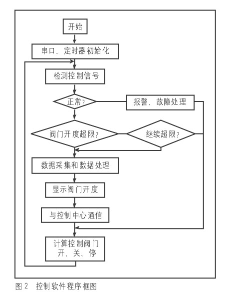 控製軟件采用C語yu言yan,為wei提ti高gao程cheng序xu的de可ke靠kao性xing和he可ke理li解jie性xing,將jiang程cheng序xu設she計ji成cheng相xiang對dui獨du立li的de子zi程cheng序xu,有you利li於yu程cheng序xu的de移yi植zhi和he修xiu改gai。控kong製zhi軟ruan件jian主zhu要yao功gong能neng是shi接jie收shou來lai自zi控kong製zhi中zhong心xin的de指zhi令ling或huo控kong製zhi器qi上shang開kai、關鍵指令;接受閥門開度反饋信號,計算後輸出控製信號;向控製中心反饋信息;實時顯示閥門開度;故障報警、故障處理,其程序主框圖如圖2。