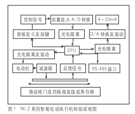 針對上述問題,上海銳凱儀表有限公司花大力氣開發了新一代RK-Z係列智能電動執行機構,較好解決了這些缺陷和不足。RK-Z係列智能電動執行機構係統構成見圖1所示。它采用全封閉、一體化結構,配以單相永磁式交流同步電動機,體積小、重量輕、結構簡單、傳動慣量小、轉矩大等特點。限位和刹車采用逐步逼近電子技術,實現了閥門“柔性全開”和“柔性全關”,取消了限位開關和刹車片,解決了長期以來困擾的限位開關易失靈、刹車片易“抱死”以及刹車時易產生大衝擊電流燒壞電動機等老大難問題。為提高整機可靠性,采用了可靠性設計、可靠性試驗、失效分析和嚴格的篩選、老化等工藝措施,並最大限度地減少了可動部件,使整機MTBF值達到40000萬小時以上。