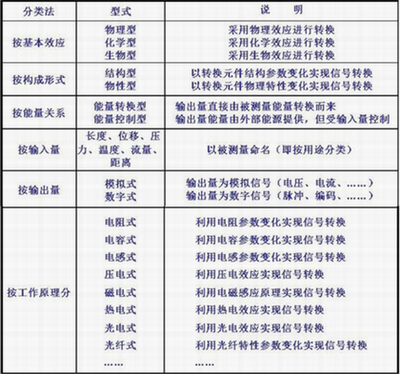 muqiansuizhejisuanjijishudefazhan,chuanganqiheweichuliqijiehezaiyiqi,xingchenglezhinenghuachuanganqidegainian,zhezhonggouchengjuyoulexinxichulidegongneng,qianjingshifenguangkuo。 傳感器的分類 傳感器的種類繁多,分類方式多種多樣。對於被測量,可以用不同的傳感器來測量;而對於同一原理的傳感器,通常又可以測量多種非電量。 具體分類可按轉換的基本效應、構成原理等分多種,其中又以按照工作原理分類最為詳細(表1)。
