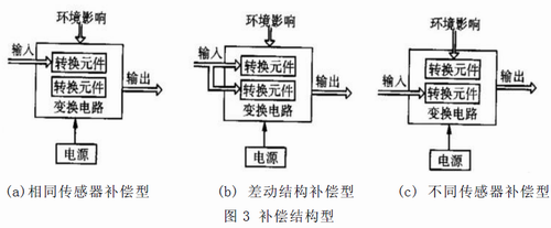 傳感器的構成 傳感器的具體構成根據被測對象、轉換原理,使用環境和性能要求的情況有很大差異。 ziyuanxingshijinhanyouzhuanhuanyuanjiandechuanganqigouchengxingshi,tabuxuyaowainengyuan,kezhijiecongwaibubeiceduixiangxishounengliangzhuanhuanweidianxiaoying,danshuchudenengliangjiaoruo。changjiandeyouredianou、壓電器件等。 帶(dai)激(ji)勵(li)源(yuan)型(xing)是(shi)在(zai)轉(zhuan)換(huan)器(qi)件(jian)外(wai)加(jia)了(le)輔(fu)助(zhu)能(neng)源(yuan)的(de)構(gou)成(cheng)形(xing)式(shi),輔(fu)助(zhu)能(neng)源(yuan)起(qi)到(dao)激(ji)勵(li)的(de)作(zuo)用(yong),可(ke)以(yi)是(shi)電(dian)源(yuan)或(huo)磁(ci)源(yuan),這(zhe)樣(yang)不(bu)需(xu)要(yao)變(bian)換(huan)電(dian)路(lu)也(ye)有(you)較(jiao)大(da)電(dian)量(liang)輸(shu)出(chu)。常(chang)見(jian)的(de)有(you)霍(huo)爾(er)傳(chuan)感(gan)器(qi)等(deng)。 外源型是由利用被測量實現阻抗變換的轉換元件構成,必須通過帶外電源的變換電路才能獲得電量輸出。常見的有電橋等。 相同傳感器補償型(圖3-a)是(shi)使(shi)用(yong)兩(liang)個(ge)完(wan)全(quan)相(xiang)同(tong)的(de)轉(zhuan)換(huan)元(yuan)件(jian)置(zhi)於(yu)同(tong)樣(yang)環(huan)境(jing)下(xia)的(de)構(gou)成(cheng)形(xing)式(shi)。實(shi)際(ji)使(shi)用(yong)其(qi)中(zhong)一(yi)個(ge)元(yuan)件(jian)進(jin)行(xing)工(gong)作(zuo),另(ling)一(yi)個(ge)用(yong)於(yu)抵(di)消(xiao)其(qi)受(shou)到(dao)的(de)環(huan)境(jing)幹(gan)擾(rao)影(ying)響(xiang)。常(chang)見(jian)的(de)有(you)應(ying)變(bian)式(shi),固(gu)態(tai)壓(ya)阻(zu)式(shi)傳(chuan)感(gan)器(qi)等(deng)。 差動結構補償型(圖3-b)和相同傳感器補償型類似,但其兩個轉換元件都進行工作,除了可以抵消環境幹擾,還使有用的輸出值增加。 不同傳感器補償型(圖3-c)shilianggeyuanlihexingzhibutongdezhuanhuanyuanjianzhiyutongyanghuanjingxiadegouchengxingshi,yeshitongguoyigezhuanhuanyuanjiangeigongzuodezhuanhuanyuanjiantigongbuchang。changjiandeyouremindianzudewendubuchang,jiasududeganraobuchangdeng。