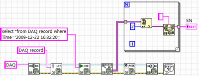 仍以DB Tools Select Data.vi為例,該VI已經將SELECT語句預先集成好,我們隻要在optional clause接線端寫入WHERE語句,寫上判斷條件即可。WHERE語句作為判斷語句,可以支持很多運算符寫入各種條件隨意讀取數據庫: 比較運算符(大小比較):>、>=、=、<、<=、<>、!>、!<; 範圍運算符(表達式值是否在指定的範圍):BETWEEN…AND… NOT BETWEEN…AND…; 列表運算符(判斷表達式是否為列表中的指定項):IN(項1,項2……) NOT IN(項1,項2……); 模式匹配符(判斷值是否不指定的字符通配格式相符):LIKE、NOT LIKE; 空值判斷符(判斷表達式是否為空):IS NULL、NOT IS NULL; 邏輯運算符(用亍多條件的邏輯連接):NOT、AND、OR; 比如我們要將時間在“2026-04-07 15:51:40”測試的所有產品的SN號都讀出來,可以這樣編寫程序,見下圖(圖1):