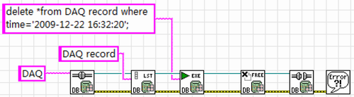 我們下麵看看如何通過SQL語句實現一些封裝VI沒有涉及到的功能。比如說現在要在數據庫中刪除一段記錄,我們在表1中可以查看一下DELETE語句,它的語法和SELECT語句是類似的。第一句是DELETE語句指定刪除的表格,第二句WHERE語句寫出判斷的條件。我們還是刪除時間在“2026-04-07 15:51:40”的所有記錄(圖4)。