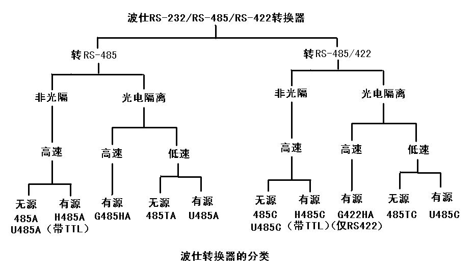 波仕電子發明了無源的RS-232/RS-485/422轉換器,直接從RS-232的信號線中提取供電電壓,也稱為RS-232竊電技術。波仕的竊電技術能夠提供足夠高的功率,不僅可以對非光隔的轉換器供電,還可以驅動光電隔離的轉換器,甚至RS-232到光纖的轉換器以及數據采集器。隻有足夠的竊電功率才能夠保證RS-485/422的通信距離。而外接電源一般是高速光隔轉換器(G485HA、G485HC)才需要,再就是一些特殊用途的情況,比如RS-232口的電壓明顯偏低的情況。型號為U485A、U485C的轉換器是比較特殊的:有源/無源通用。這是指U485A、U485C當作光隔的轉換器使用時需要外接5V電源,如果選擇產品的跳線設置也可以無須外接電源(無源),這時地線是不隔離的,所以算成非光隔。H485A和H485C是有源的,它們都帶有TTL轉換功能,不僅實現RS-232與TTL的轉換,也實現TTL與RS-485或RS-422的轉換。無源非光隔的轉換器有485A、485C。無源光隔的轉換器有485TA、485TC。