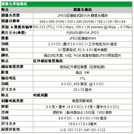 攝像頭接口應用開發包可應用於遠程監控,安全防護,資產管理,報警係統等更多應用 攝像頭接口應用開發包結合VGA照相技術和廣為流行的帶可移動內存的RabbitCore模塊,來構建事件捕捉觸發的應用係統。您可以使用友好的webjiemian,tongguoanzhuangdesifudianjilaikongzhishexiangtoudeyidong,haikeyiruanjiankongzhihongwaiganyingshizhuangzhilaichufashexiangtoupaizhao。erqieyonghukepeizhishijiantixingxitongyijingqidong,gaixitongzaipaizhaohoukeyizidongfasongyifenge-mail,內容包括該照片存放位置的鏈接。 攝像頭接口應用開發包為基於Rabbit係(xi)統(tong)提(ti)供(gong)係(xi)統(tong)實(shi)例(li),例(li)如(ru)遠(yuan)程(cheng)監(jian)控(kong),安(an)全(quan),資(zi)產(chan)管(guan)理(li),另(ling)外(wai)還(hai)有(you)報(bao)警(jing)係(xi)統(tong)和(he)其(qi)他(ta)事(shi)件(jian)觸(chu)發(fa)係(xi)統(tong)。該(gai)開(kai)發(fa)包(bao)包(bao)括(kuo)兩(liang)個(ge)用(yong)於(yu)遙(yao)攝(she)和(he)傾(qing)斜(xie)的(de)伺(si)服(fu)電(dian)機(ji),用(yong)於(yu)事(shi)件(jian)觸(chu)發(fa)的(de)紅(hong)外(wai)照(zhao)相(xiang)檢(jian)測(ce)裝(zhuang)置(zhi),用(yong)於(yu)控(kong)製(zhi)的(de)RCM3365 RabbitCore模塊。由於RCM3365模塊提供至少128MB的存儲容量和以太網絡連接,用戶可以存儲和管理照片,通過email發送事件通知或傳送日誌文件到FTP服務器。 關鍵特點 工作頻率為44MHz的RabbitCore模塊, 10/100Base-T 以太網絡連接 存儲容量為512K 的Flash / 512K的SRAM, 16MB 的NAND (數據),和可移動存儲容量的套接字 VGA攝像頭模塊(JPEG壓縮格式), 司服電機,和紅外感應裝置 提供例程演示事件捕捉選項如:裝置檢測,I/O輸入,和時間事件 時間戳照相和事件通知選項如:email通知和FTP上傳 FAT 文件係統包括存儲和管理照片和數據 友好的簡單事件管理web界麵 設計優勢 基於Rabbit的應用係統,使用攝像頭和電機伺服來捕捉事件和控製數據 提供範例用於配置事件捕獲機製。 RabbitCore模塊可作為 HTTP ,FTP服務器, 或是智能設備。 提供Royalty-free 的FAT 軟件模塊 應用 適用於遠程設備、車間和場地監控 安保係統 任何事件驅動的應用係統 報警係統的輔助係統 軟件工具 例程和函數庫演示了如何拍攝照片,控製伺服電機以及使用我們可靠的FAT網絡訪問文件係統管理圖像數據。RabbitCore模塊在係統中作為服務器,用戶可以使用標準的web瀏覽器通過一個簡單的web界麵來監控係統 ―― 因此您能從在全世界任何角落進行監控。該密碼保護的web界麵允許您基於各種複雜的事件觸發來拍攝照片,以及從每個事件獲得信息 ――包括時間戳,時間觸發器,事件後行為。攝像頭接口開發包適用於項目的快速開發,也提供軟件工具為商業產品的開發。