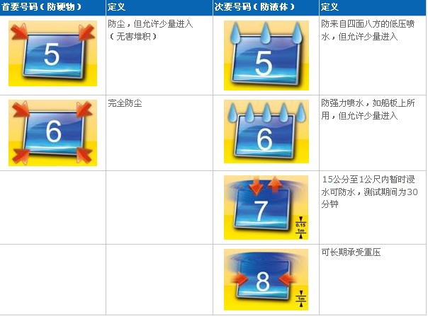 參考國際電工委員會(IEC) 60529 2.1版:2001-02年-IP 65 |