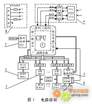 外部開關信號采集使用光耦(IC1,IC2隻畫出其中四路)作電器隔離,光耦輸出端使用一個數據緩衝器74HC244(IC9)對光耦輸出信號進行緩衝後傳送到CPU的數據總線供CPU讀取。(見圖6)