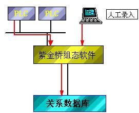 在使用關係數據庫時,首先,我們先利用紫金橋組態軟件來采集現場的PLC來獲取實時數據,或通過人工錄入的方式獲取生產數據,再以紫金橋組態軟件為平台,通過編寫SQL語句,將實時數據存儲到關係數據中的靜態表中,形成靜態數據,以完成數據的存儲。如下圖所示: