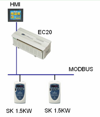 SK係列變頻器頻率通過MODBUS總線的通訊方式給定,PLC利用輸出端子控製SK係列變頻器的啟動和停止。