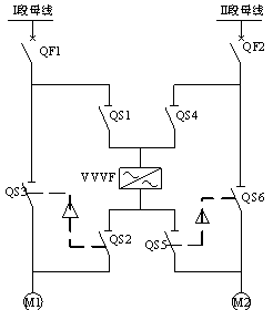 如果兩路電源同時供電,M1工作在變頻狀態,M2工作在工頻狀態時,QS3和QS4、QS5分閘,QS1、QS2和QS6處於合閘狀態;M2工作在變頻狀態,M1工作在工頻狀態時,QS1和QS2、QS6分閘,QS3、QS4和QS5處於合閘狀態;如果檢修變頻器,QS3和QS6可以處於任一狀態,其它隔離開關都分閘,兩台負載可以同時工頻運行;當一路電源檢修時,可以通過分合隔離開關使任一電機變頻運行。