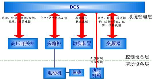 係統進行變頻改造前後與現場控製係統的接口結構如圖2。以DCS為例:改造前,DCS針對高壓主輔機設備的控製調節端口,連接高壓開關、執行機構等執行設備。改造後,DCS的這些信號引入HCU通過協調控製技術進行信號處理、指令分配、控製對象協調後驅動執行設備運行。至於在何種情況下啟動哪些設備、進行何種方式的調節等邏輯判斷和指令下達,則無需由DCS來實現。