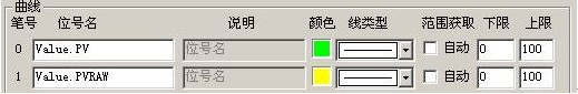 為了方便的觀看轉換的結果,我們使用實時趨勢組件來顯示轉換前和轉換後的曲線圖。將導航器切換到畫麵頁,雙擊“窗口”項創建一個名為Draw1的窗口。點擊工具條按鈕  ,在隨後彈出的子圖選擇對話框中,雙擊“趨勢分析/實時趨勢”組件,在窗口中創建該組件。雙擊實時趨勢組件,彈出設置對話框,在“曲線”頁上,在0號筆的位號編輯框中填入Value.PV,在1號筆的位號編輯框中填入Value.PVRAW,同時取消這兩支筆的範圍獲取自動選項,如下圖所示: