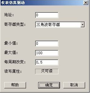 在這裏我們使用信波提供的仿真設備驅動程序,來模擬從現場采集到的數據。將導航器切換到數據庫頁,雙擊“設備驅動/仿真儀表/紫金橋/儀表仿真驅動”項,彈出設備定義對話框。在對話框中輸入設備名Sim,數據更新周期50毫秒,設備地址1,點擊“完成”按鈕,完成仿真設備Sim的定義。