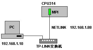如上圖所示,將計算機網卡的IP地址配置為192.168.1.10,將NETLINK的RJ45端口鏈接到交換機端口上,另一端插入CPU314的MPI通訊口,NETLINK是由CPU314的MPI口供電的。如果CPU上已經連接了其他監控設備如觸摸屏,則可以選用西門子帶編程口的網絡插頭。