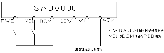 變頻恒壓供水係統采用一電位器設定壓力(也可采用麵板內部設定壓力),采用一個壓力傳感器(反饋為4~20mA或0-10V)檢測管網中壓力,壓力傳感器將信號送入變頻器PID回路,PID回路處理之後,送出一個水量增加或減少信號,控製馬達轉速。如在一定延時時間內,壓力還是不足或過大,則通過PLC作工頻/變頻切換,使實際管網壓力與設定壓力相一致。