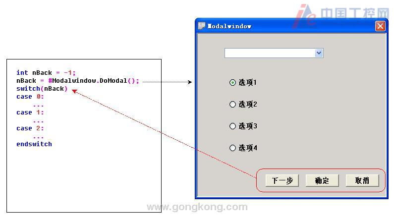 通常情況下,我們可以使用模態窗口的EndModal(int Expr)函數中的參數Expr來指定該窗口結束時的返回值。正如上圖所示,我們可以通過Expr得知用戶點擊的是【下一步】、【確定】亦或是【取消】按鈕。但有些時候,僅僅得到這些信息是不夠的。例如,我們需要得知在點擊【下一步】或者“確定”按鈕後用戶具體選擇了窗口ModalWindow中的哪些選項。