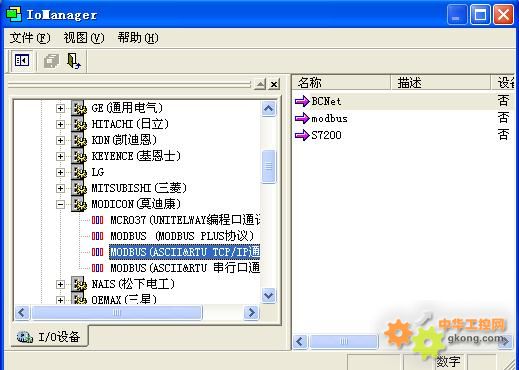 1、打開力控開發係統——IO設備組態,選擇“PLC-MODICON(莫迪康)—modbus TCP通訊”