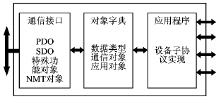CANopen協議是由CiA協會針對CAN協議的不完整性而定義出的一個更高層次的協議——應用層協議。一個CANopen 設備模塊可分為3部分,如圖1所示。通信接口和協議軟件用於提供在總線上收發通信對象的服務;不同CANopen 設備間的通信都是通過交換通信對象來完成的,這一部分直接麵向CAN 控製器進行操作。對象字典描述了設備使用的所有數據類型、通信對象和應用對象;對象字典位於通信程序和應用程序之間,用於向應用程序提供接口。應用程序對對象字典進行操作,即可實現CANopen通信。它包括功能部分和通信部分,通信部分通過對對象字典進行操作實現CANopen 通信;而功能部分則根據應用要求來實現。