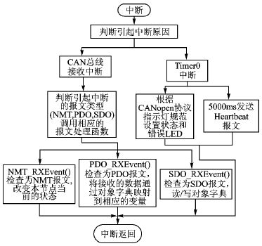 伺服電機模塊上電以後,根據CANopen協議從節點的性質,係統在進行完初始化參數配置後,發送Bootup報文通知主節點已進入預操作(preoperational)狀態,並在主循環中等待各種類型中斷的到來。在預操作狀態中,可接收主節點的SDO報文讀/寫對象字典。比如當無法使DA零點輸出偏置電壓達到標準值時,可以通過修改對象字典的電壓偏置值相來進行調整。NMT報文也可在預操作狀態中接收,用於改變節點狀態,進入伺服電機模塊實時傳輸PDO報文的操作(operational)狀態,開始係統的正常工作。一旦係統進入預操作狀態,就會以5 000 ms為周期發送Heartbeat報文使主節點實時監控伺服電機模塊的狀態;當從節點發生錯誤時主節點就可以立刻采取措施,實現實時在線監控的功能。圖3為中斷程序流程圖。