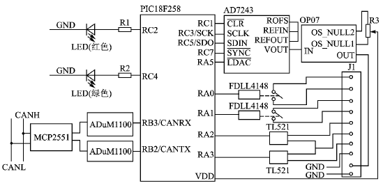 圖2中,在OP07上接有調節零輸出偏置電壓的可調電位器R3;用ADuM1100高速數字隔離器替代傳統的光電耦合器,以降低功耗,提供精確的信號;MCP2551是一種可容錯的高速CAN收發器,具有差分發射和接收能力,可將許多節點與同一網絡相連接並采用非屏蔽線部署網絡,從而降低係統成本。