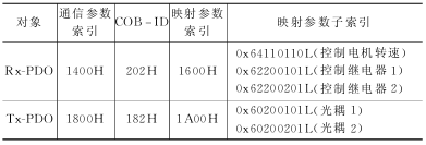 表1和表2定義的SDO報文和PDO報文分別用於讀/寫對象字典和傳送實時數據。PDO報文映射參數子索引的內容代表PDO報文中各字節的用途,比如:RxPDO報文映射參數子索引0x64110110L指對象字典索引0x6411和子索引0x01,占16位的數據內容,即控製電機轉速數據。此外,係統還定義了一個接收NMT報文,用於實現主節點對從節點的組態;一個Heartbeat(心跳)報文,以5 000 ms為周期發送,使主節點實時監測從節點狀態並在發生錯誤時及時進行處理。