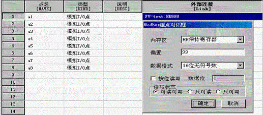 建立數據庫模擬I/O點,a1-a8,然後關聯外部連接,點名建立後雙擊後邊外部連接的空白處,彈出modbus組點對話框,選擇保持寄存器也就是modbus的功能碼03,偏置地址選擇99,對應的modbus協議的地址是100(紫金橋軟件的偏置地址加1對應的是modbus協議地址)如圖6所示;