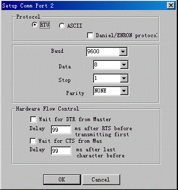 通訊協議選擇“RTU”,波特率,數據位,奇偶校驗和停止位和紫金橋組態軟件上的端口參數設置要一致,點擊OK設置完成。