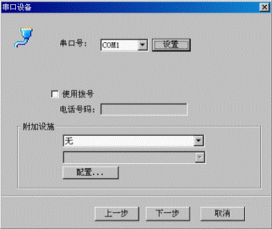 設置完成,點擊“下一步“,進入下一個對話框,串口號選擇”com1”。如圖3所示;