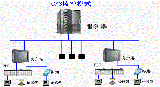 C/S聯網模式( Client/Server,客戶機/服務器),通常數據采集、前端現實、數據緩存、人機操控界麵等功能會在前置機(也就是客戶機)上實現,而數據彙總、係統總成、集中控製等功能會在服務器上實現。其係統架構可參看下圖所示: