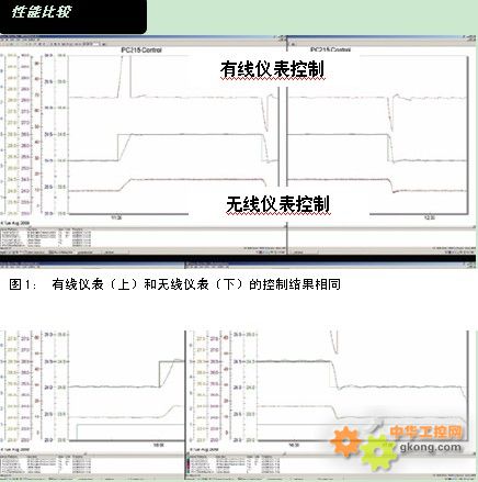 圖1: 有線儀表(上)和無線儀表(下)的控製結果相同 | 在實驗進行中,我們把WirelessHART技術的應用進行了擴展,首先用三台多點無線溫度變送器(每台設備有4個熱電阻輸入)來監測吸收塔的溫度分布情況,另外將兩台無線pH變送器分別安裝在吸收塔入口和出口,間接測量氨溶液中二氧化碳的濃度。采用無線變送器提高了溫度和pH值測量的精度和可靠性,從而改善了氣提塔和吸收塔的操作條件,由於無線儀表由電池供電,消除了有線儀表回路接地的影響。