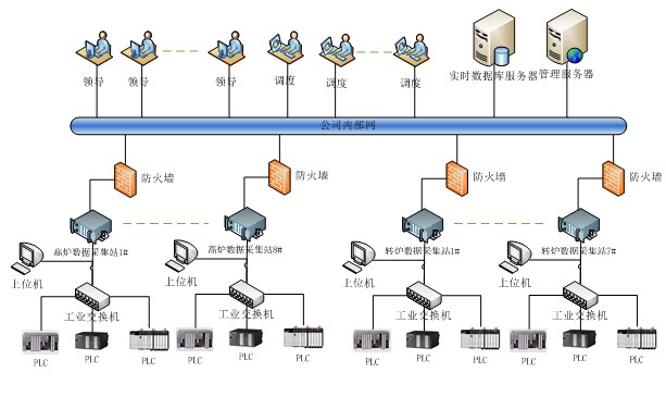 將8座高爐和7座轉爐的生產過程數據從自動化控製係統(PLC)中采集上來,然後通過網絡傳輸到監控中心的實時數據庫裏麵,實現生產數據的實時采集、實時存儲和歸檔。
