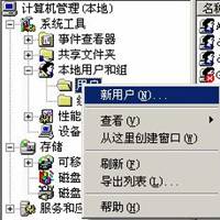 打開“控製麵板”,選擇“管理工具”中的“計算機管理”,在導航樹中選擇“係統工具”下的“本地用戶和組”,展開後在其中的“用戶”上點擊鼠標右鍵選擇“新建用戶”,如下圖: