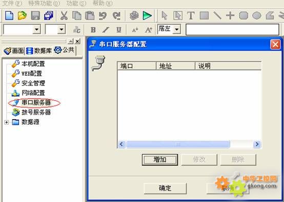 進入開發環境,在導航樹中選擇“公共/串口服務器”並單擊,出現串口服務器配置框: