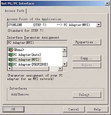 (1)在桌麵執行菜單命令“開始→程序→PRODAVE_S7→PG-PC Interface”,打開接口參數設置對話框。