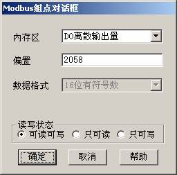 台達PLC中的寄存器M10,查表得到Modbus地址為002059,寄存器類型為DO,紫金橋中的偏置地址為2058。因此,得到如下輸入: